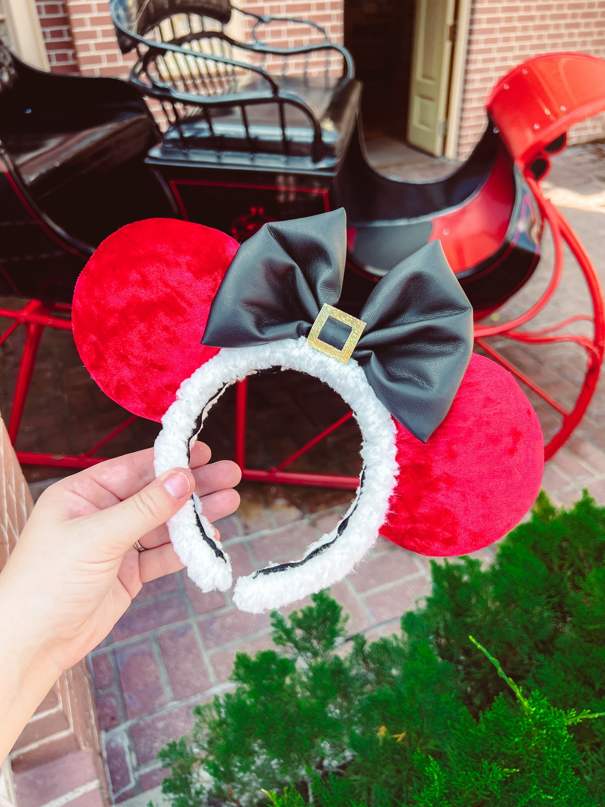 Ears inspired by the jolliest man! Crushed red velvet ears, white sherpa headband, black faux leather bow, and a gold leather "buckle"!