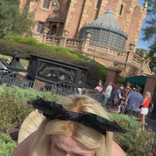 Black ears that glisten green and purple hues! Black lace and black little bows.